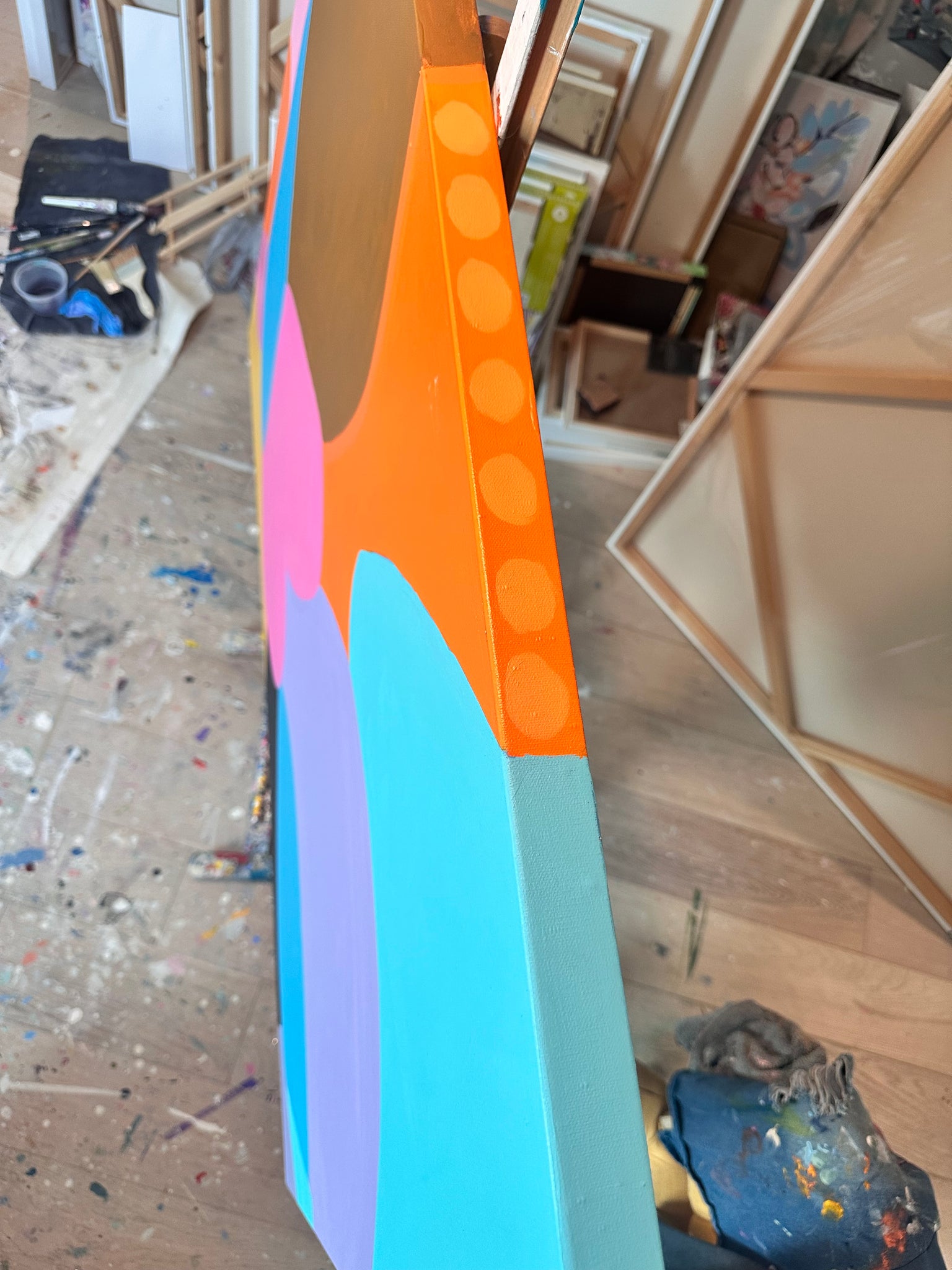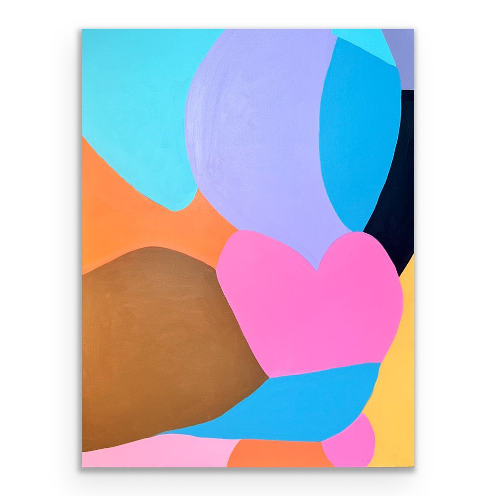 "Masking Room For Me” measures: 48”x36”, acrylic paint on canvas. This piece was created after a thought of how it’s ok to take up space. We all need to embrace space and not confine ourselves to smaller ideas. This was the 1st in a series of colorful, large modern shaped paintings. Sides are uniquely painted in unison with the front. Signed on side and back.