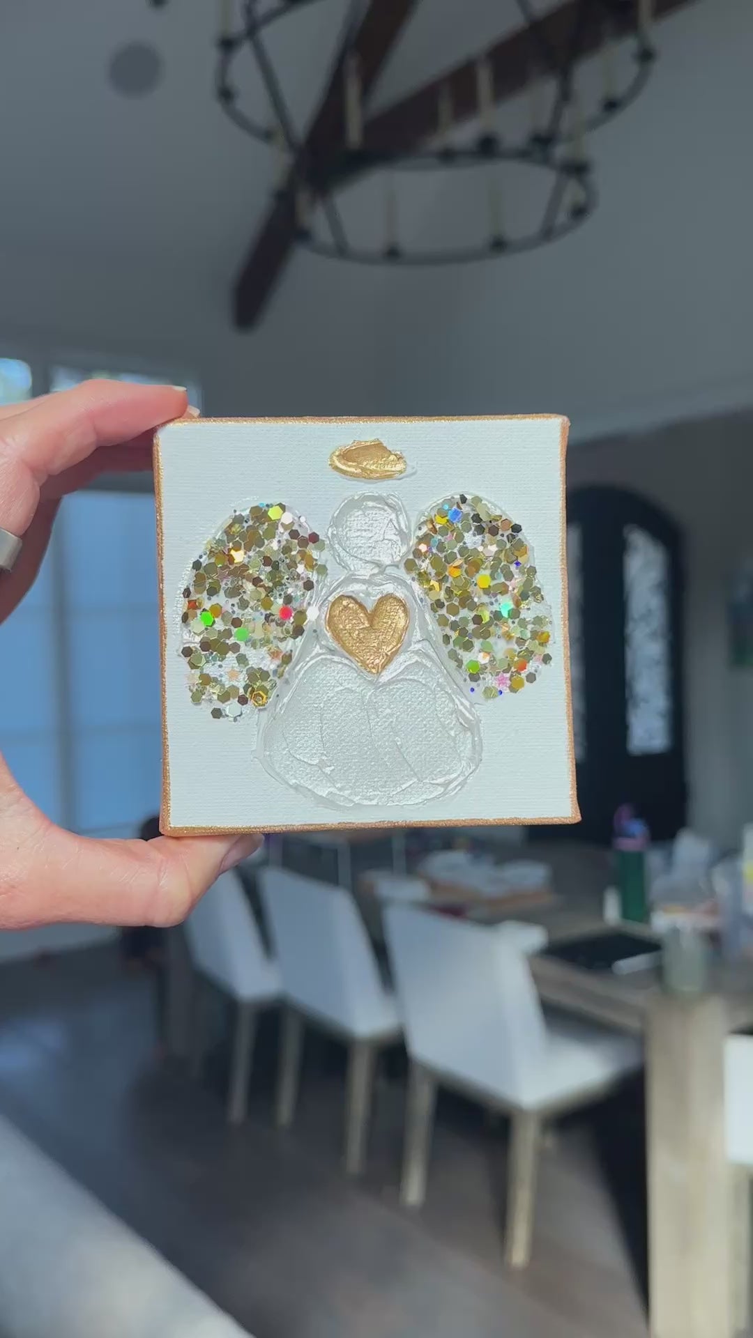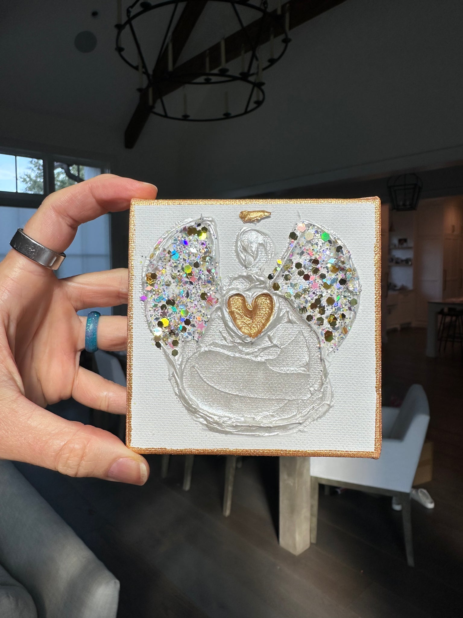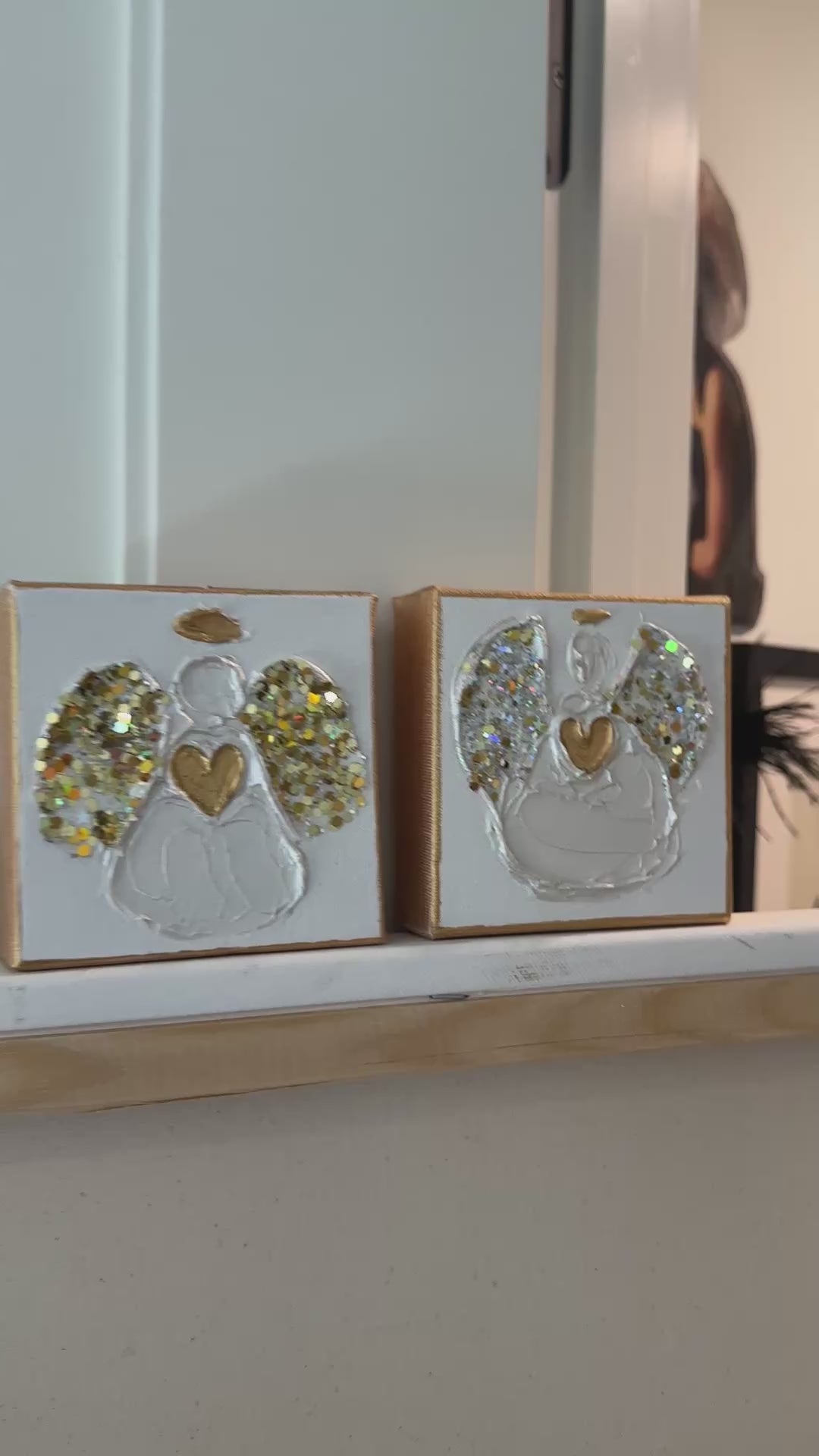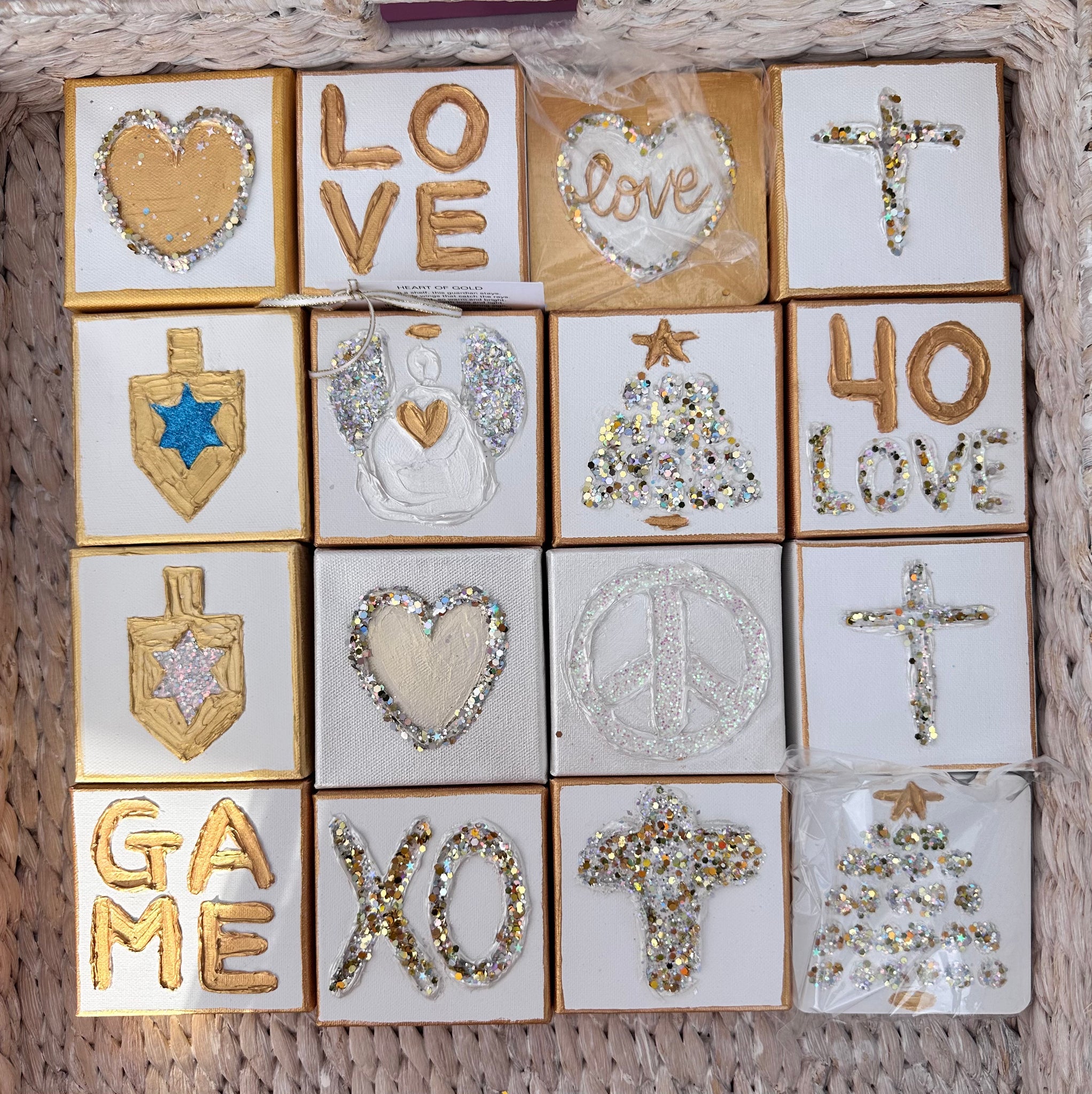 Gift a Heart of Gold original piece of art! This collection includes: angels, hearts, Christmas trees, crosses, dreidel's, Star of David, and more. Each are created on a 4”x4” boxed style stand alone canvas. These handmade art pieces take days to create. They are 1st painted with a primer, then gold paint, hand sculpted, painted again, embellished with the most sparkly glitter on the planet. Each are varnished for long lasting use. Taking a week to complete each batch! All are uniquely different but similar in design. One of a kind, ready to gift, placed in a beautiful holographic cellophane wrap with a gold bow to tie it all together.