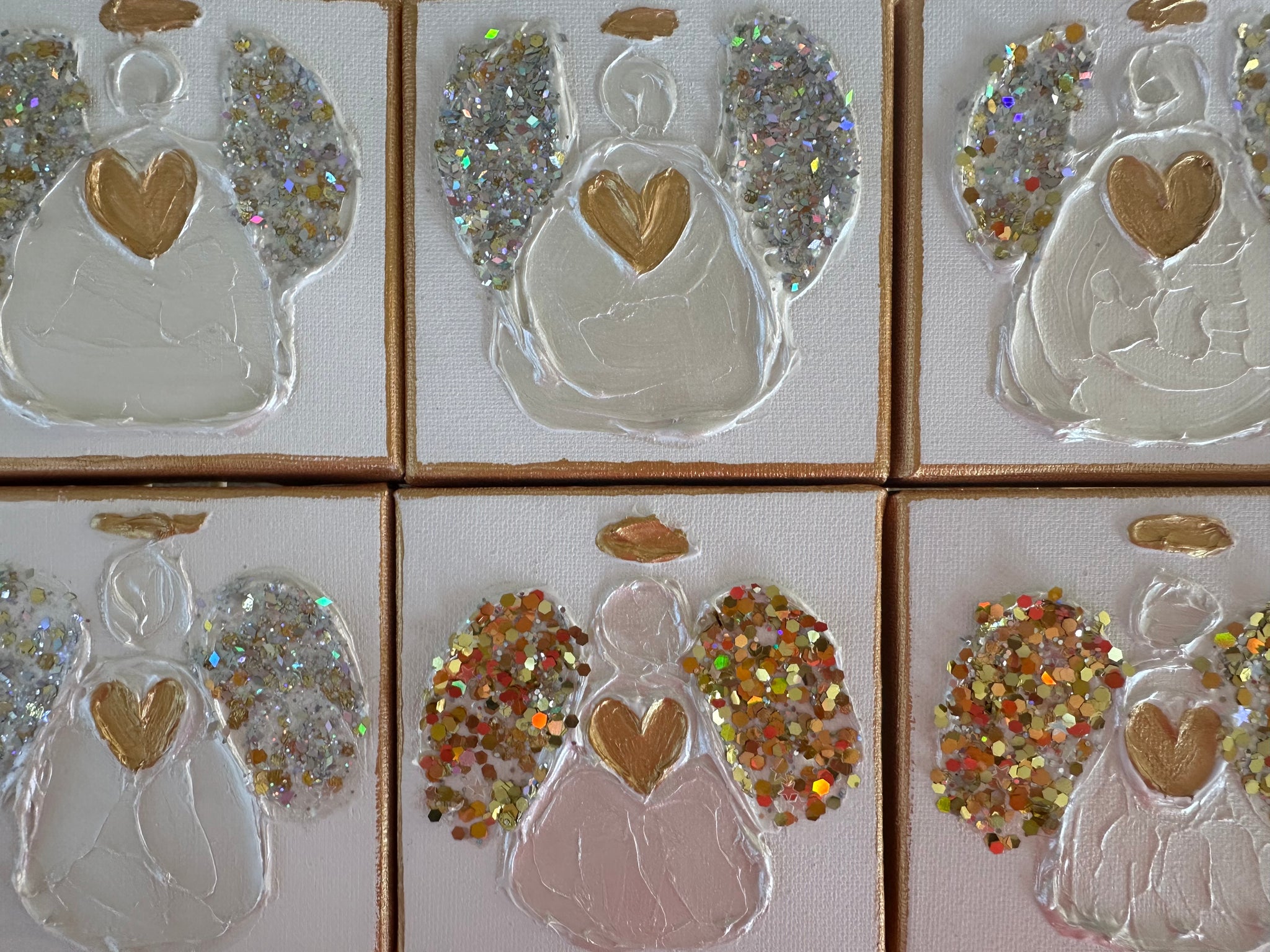Gift a Heart of Gold original piece of art! This collection includes: angels, hearts, Christmas trees, crosses, dreidel's, Star of David, and more. Each are created on a 4”x4” boxed style stand alone canvas. These handmade art pieces take days to create. They are 1st painted with a primer, then gold paint, hand sculpted, painted again, embellished with the most sparkly glitter on the planet. Each are varnished for long lasting use. Taking a week to complete each batch! All are uniquely different but similar in design. One of a kind, ready to gift, placed in a beautiful holographic cellophane wrap with a gold bow to tie it all together.