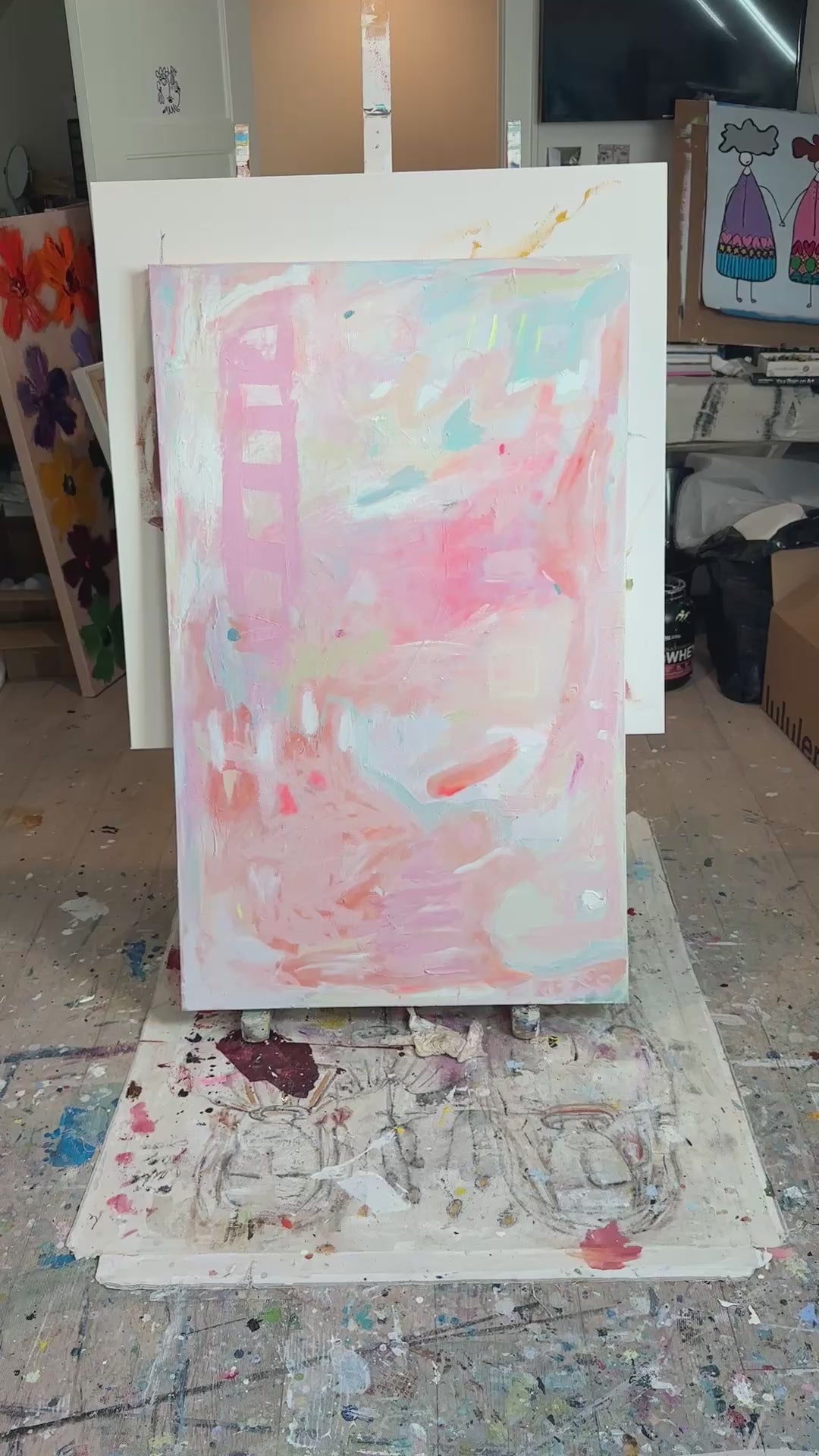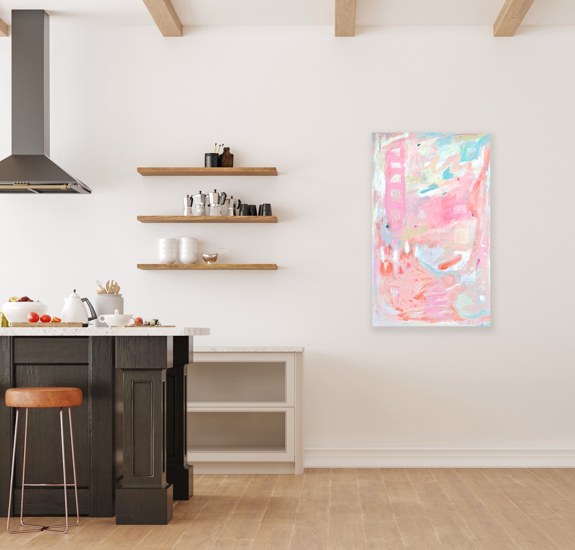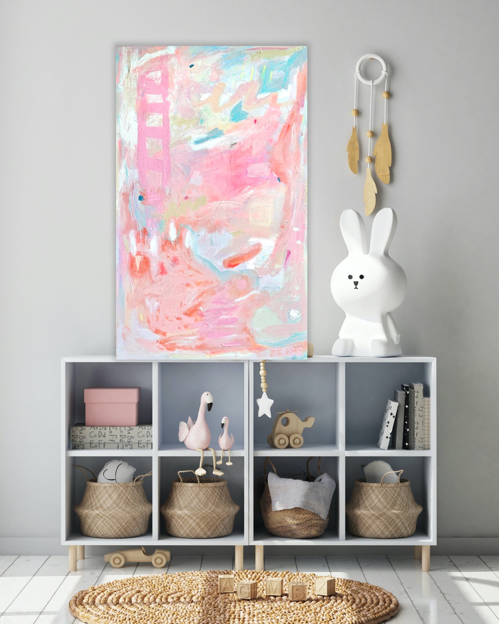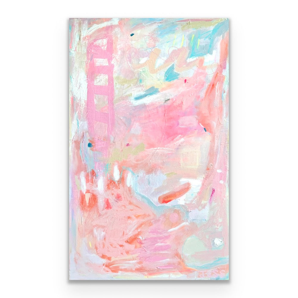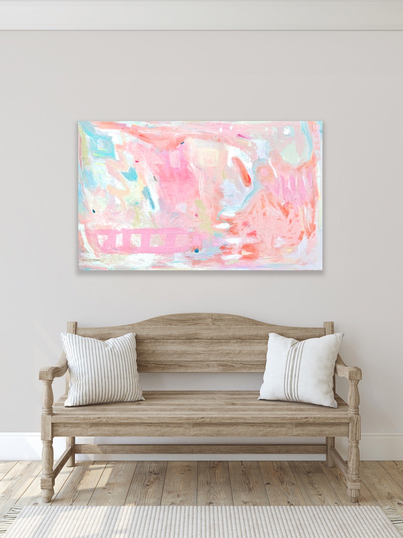 “Finders Keepers” Original Painting, acrylic and oil sticks on canvas. Measures: 30”x48". This painting is a VERY vibrant, bright colorful piece. iPhone doesn’t pick up the fluorescent orange well on photos. This piece has a warm, fluorescent peachy hue in person. Different lighting will show that. Crelated in a time of reflection, seeking a new perspective and light.